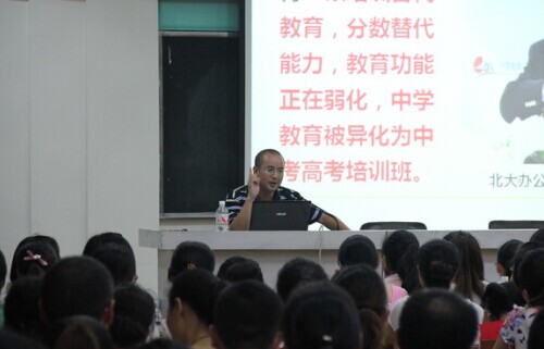 中國教育品牌網(wǎng)訊 變“圖書館”為“讀書館”、“講給學生聽”不如“拍給學生看”、變“老師建議”為“朋輩教育”、變學校硬性要求為學生主動需求……8月24日下午,在麗水市遂昌三中舉行的暑期師德培訓活動中,浙江衢州第二中學政教主任鄭友民為遂昌三中、遂昌實驗小學兩校300多名教職工開設(shè)了一場別開生面的“學生管理藝術(shù)”講座。