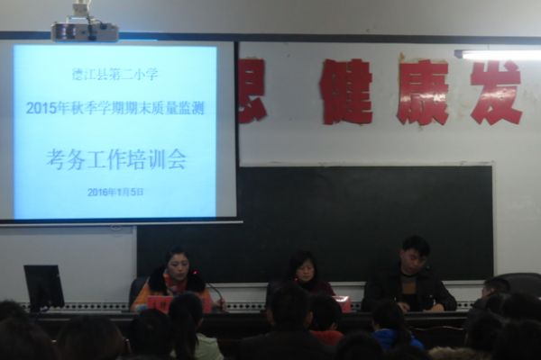 1月5日上午,德江二小在該校教師會議室召開2015年秋季學期期末質量監測考務工作培訓會,來自該縣第三小學、第五小學、第六小學的監考教師及該校考務工作人員70余人參加。