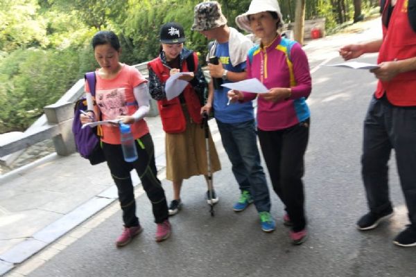 8月16日與17日,小隊成員們拿到調查問卷,穿上印有“愛滿亭城”字樣的紅色志愿者服裝,進入景區內。兩兩一組,為過往游客宣傳文明出游知識,并請他們填寫景區滿意度調查問卷。