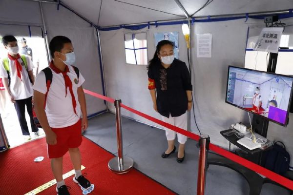 學生間隔一米距離有序測溫