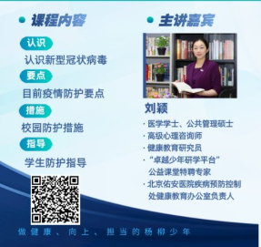 8:30上好“開學第一課”,學校聯合首都醫科大學北京佑安醫院疾病預防控制處劉穎老師為學生送上一堂專業的疫情防控知識教育課,旨在為師生在校園生活中提供專業化的防護指導。