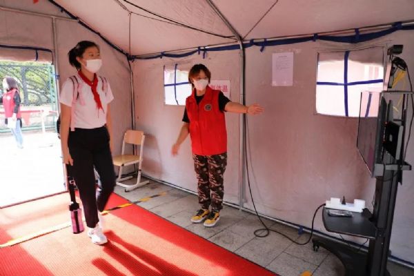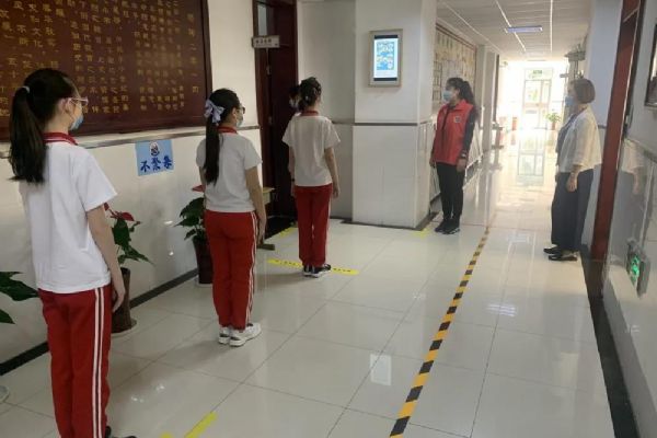 早晨7:00,身著紅馬甲、手持小彩旗的志愿者老師們,站在各自的點位上,微笑著指引學生分流有序入校進班,沉寂了數個月的校園重獲生機。