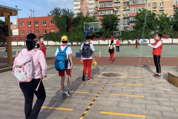 6月1日兒童節,垂楊柳中心小學六年級學生迎著初夏的暖風重返校園。潘家園街道辦事處工委書記張貴林、副主任周廣軍、街道城管大隊長付占鑫、副隊長熊琳琳、綜治辦主任趙學軍、建設辦公室文教事務副科長李奇、松榆西里社區黨委書記李秀穩、主任劉菁以及教委科室聯絡員、學校責任督學、疾控中心駐校醫生、派出所干警一同來到學校協助組織返校復課。
