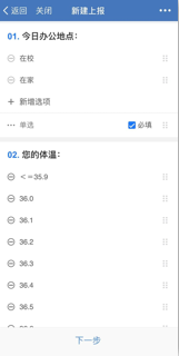 具體操作是在企業微信的“健康上報”應用中創建報表。由信息老師任管理員設計每天體溫監測報表。