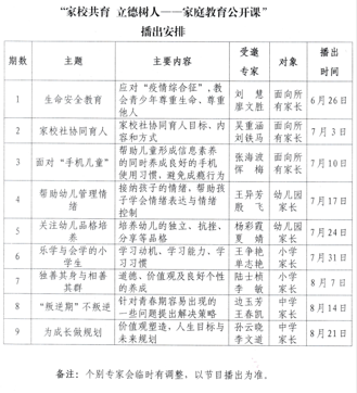 各位尊敬的家長: 您好! 為做好疫情防控常態化新形勢下的家庭教育及解決青少年心理問題,垂楊柳中心小學邀請家長們一同觀看由教育部關工委和中國教育網絡電視臺聯合推出的“家校共育 立德樹人——家庭教育公開課”,此次課程邀請了家庭教育知名專家授課并給家長進行答疑解惑。