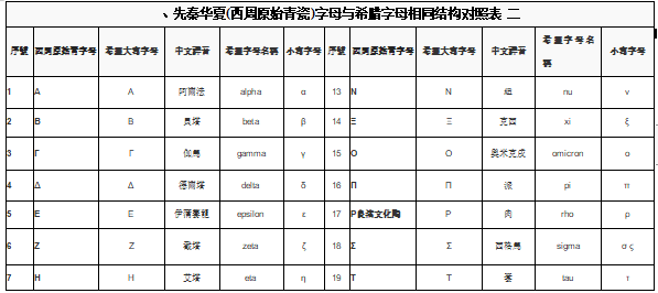 先秦華夏(原始青瓷)字母款與希臘字母結構相同譯文對照文(表二)。如下:見表16