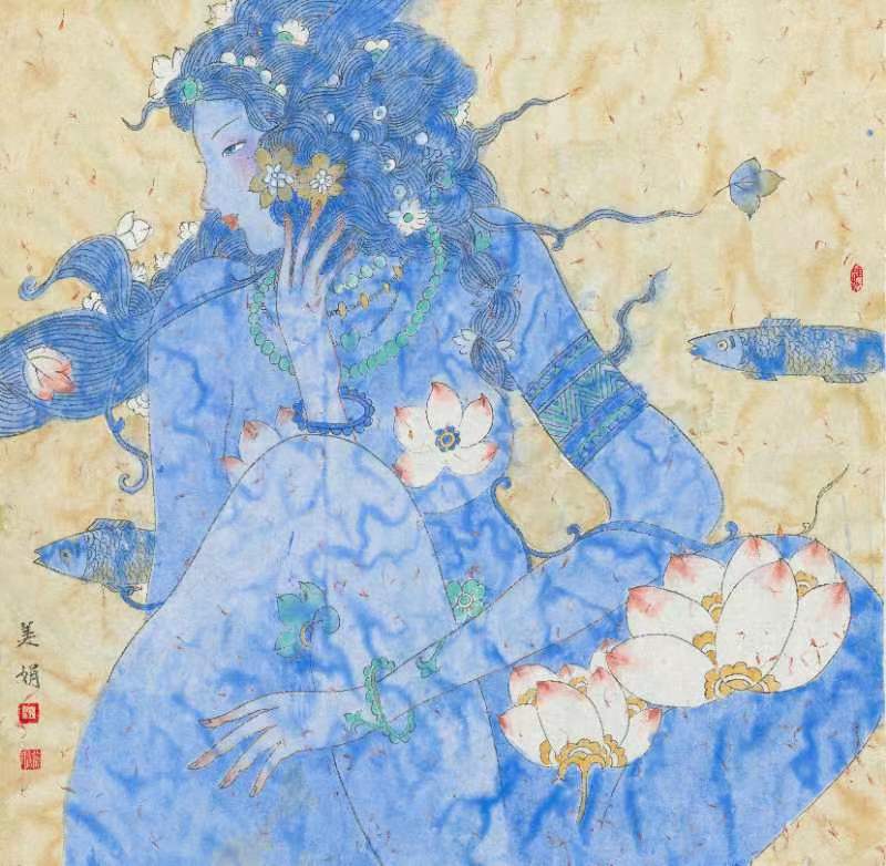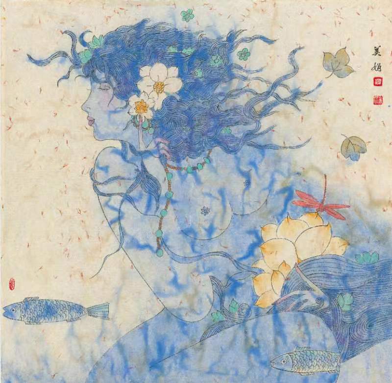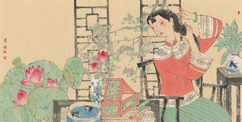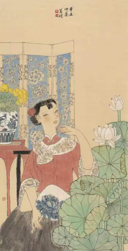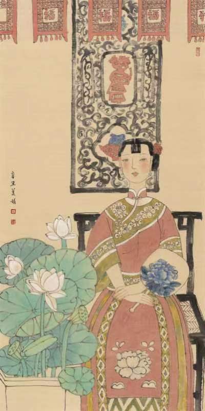 移步前行,中國工筆重彩花鳥、人物畫或筆觸細膩栩栩如生,或寥寥幾筆神韻飛揚。在一幅《晉韻流芳》圖前停下腳步,圖中的女主皮膚白晳、鵝頸優雅,華服美顏,十指纖纖,微風逗弄額前一縷俏皮的流海,發上紅花與庭前荷事相映生姿,午后暖陽慵懶地撫著椅上人,令人不忍卒步,愿靜靜佇立,感受似水流年。