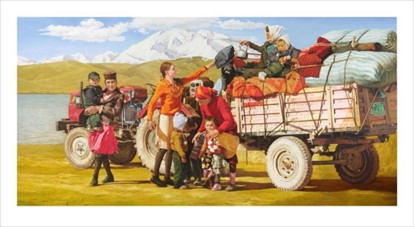 畫家選取了初春時節金黃色陽光照耀著的塔吉克族為代表一家人準備乘載拖拉機出行的場景,畫面以女人和孩子為主要的表現對象,人物安排錯落有致,虛實相應。即使將人物一組單獨拿來看都不乏畫面的節奏與韻律,繪畫語言的藝術在畫家的筆下悄然形成,一切都好似有了呼吸一般。拖拉機作為工業感的大機器橫構并貫穿于人物身后,其形態的硬朗平衡了女人們的柔和,增添了畫面的時代感于現代氣息。活動著的人物與他們的日常身后,卡拉庫勒湖靜靜的躺在那里,注視著一切發生,目送萬物的每一次經過,慕士塔格峰在更遠處高挺的佇立著,見證無數個四季發生,無論時代如何變遷,“神山圣水”永遠安寧,永遠不變。