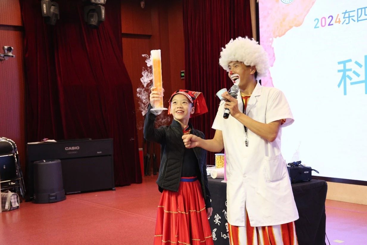 22日,東四九條小學為千家店中心小學的師生們準備了一場熱情洋溢的歡迎儀式。金帆舞蹈團的同學們以精湛的舞藝展示了學校藝術教育的豐碩成果,贏得了現場觀眾的陣陣掌聲和歡呼。緊接著,金鵬科技團也為同學們帶來了一場精彩絕倫的科學秀表演,火焰掌、煙霧大炮、冒煙的爆米花、馬德堡半球等科學實驗輪番上演,學生們紛紛上臺互動,現場氣氛熱烈非凡。