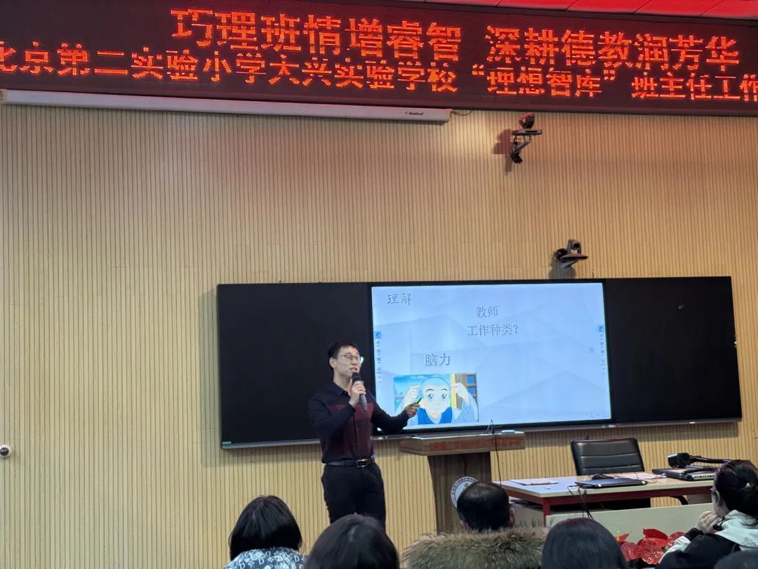 隨后,北京小學翡翠城分校的孫健權老師閃亮登場。作為北京市紫禁杯優秀班主任、骨干班主任以及大興區班主任工作室成員,孫老師憑借其豐富閱歷與獨特視角,深入剖析班主任能力的錘煉與升華之道。他的分享如和風細雨,潤澤每一位班主任的心靈,助力他們在育人旅程中攀登新的高峰,進一步拓展了班主任們的教育視野與工作思路。