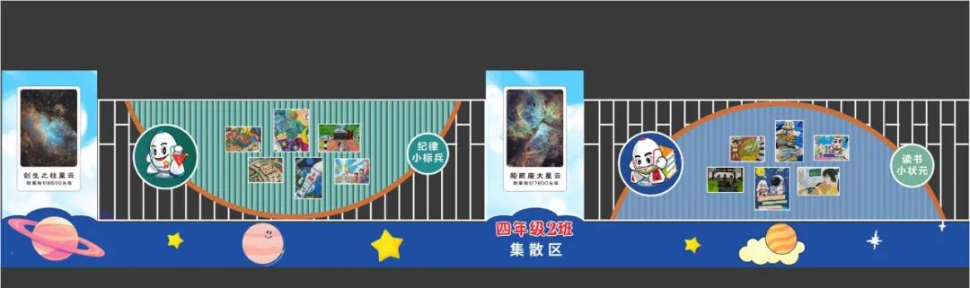 漫步學安路,航天元素與校園文化交相輝映,形成獨特的視覺語言。道路顯眼位置設置的航天主題文化墻,以活潑的卡通風格呈現火箭升空、宇航員漫步星際等場景,既傳遞“減速慢行” 的安全提示,又潛移默化地普及航天知識。各大星云圖也成為學生討論學習的熱點。校門口左右兩側的展示區,更成為了校園文化的“微窗口”,繪畫作品記錄的校園生活場景,展示出學生在德、智、體、美、勞等方面全面發展。