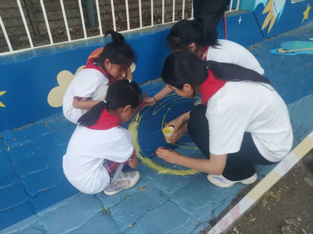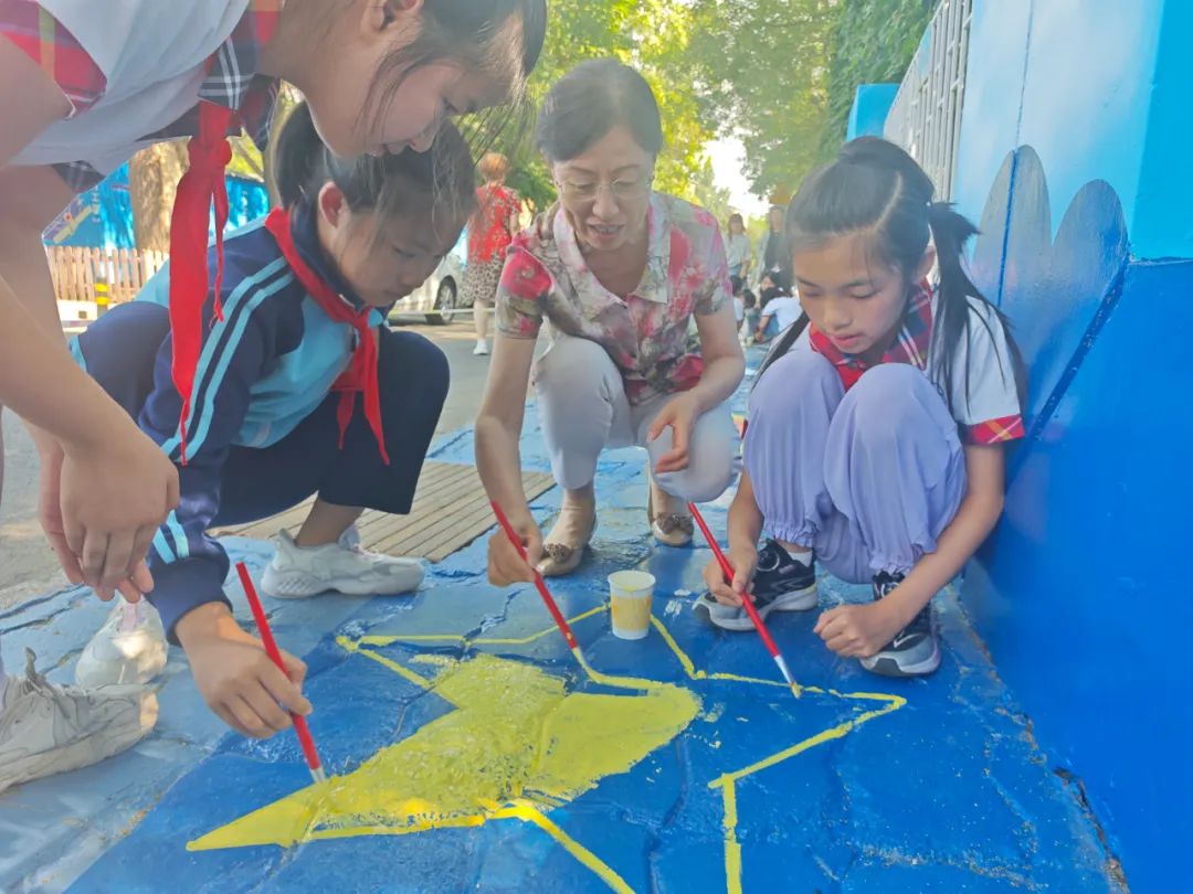 部分學生代表參與了學安路星際圖景的繪畫。他們用顏料點綴出星星的閃爍質感,畫出彎月的溫柔弧度,還在月亮周圍添上夢幻的光暈......同學們一邊繪畫,一邊互相交流著對宇宙的憧憬,分享著自己筆下每個細節的創意來源,仿佛將對太空的向往都傾注在了繪畫過程中。