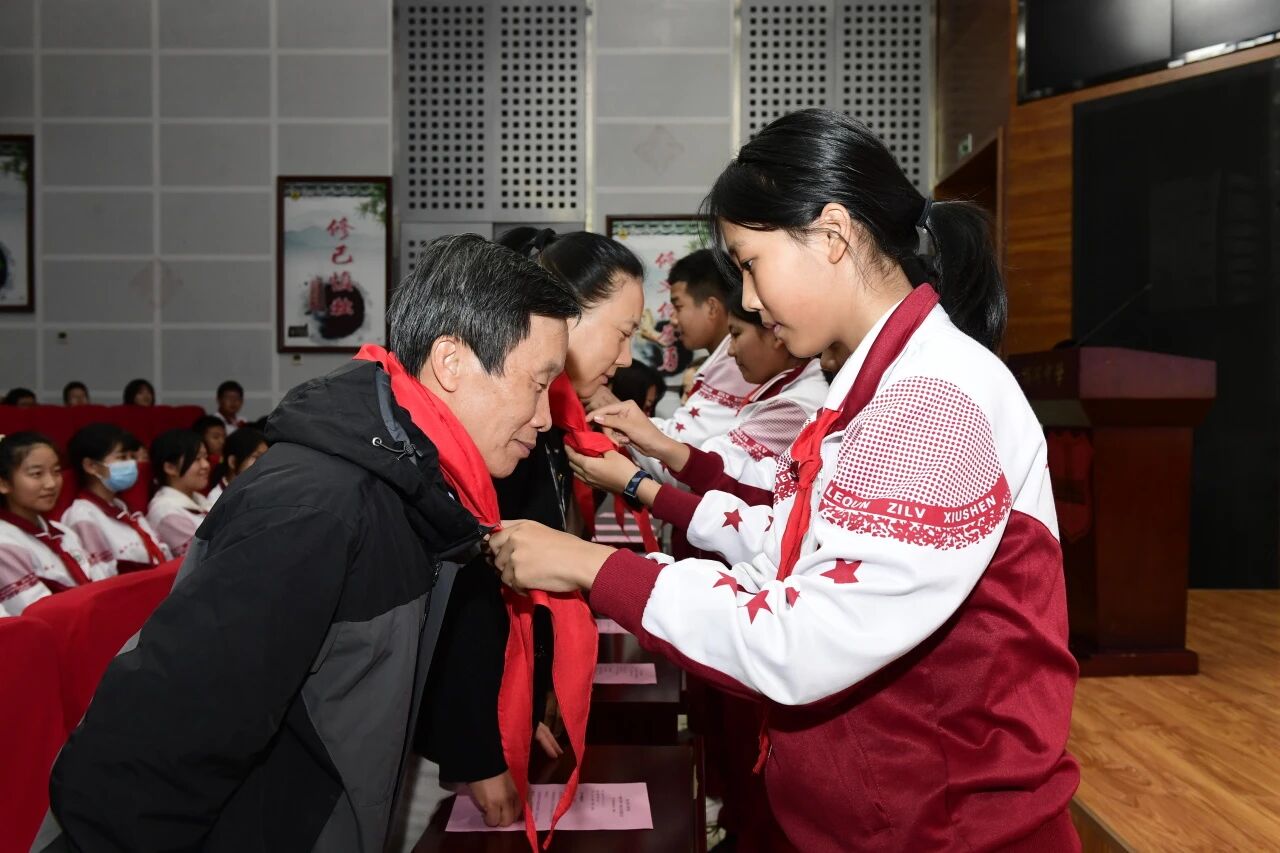 潞河中學(xué)副校長謝宏春、潞河中學(xué)副校長李晨松、潞河中學(xué)學(xué)生處主任宋久峰、初中部德育主任王雷、新疆高中班主任李敏、初中部教學(xué)主任孫寶英、團(tuán)委副書記敦帥參加了本次活動(dòng)。少先隊(duì)員代表向領(lǐng)導(dǎo)老師們敬獻(xiàn)紅領(lǐng)巾。