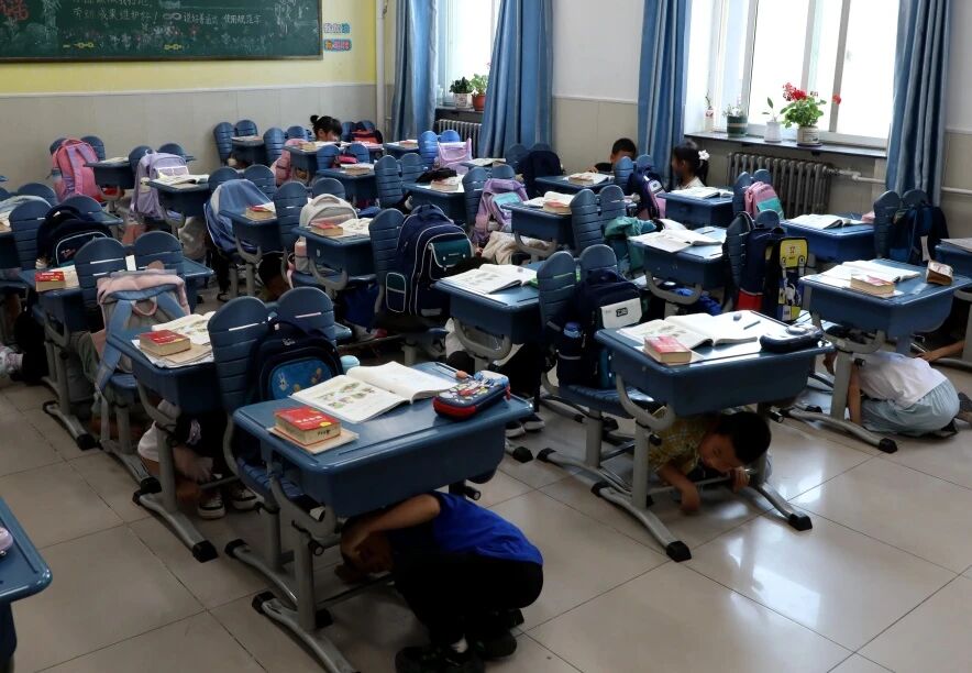5月13日上午9時,隨著一陣急促的警報聲劃破校園的寧靜,演練正式啟動。同學們迅速反應,按照日常所學,以最快的速度鉆到課桌下,雙手護頭,靜待指令。當第二聲警報聲響起后,各班教師下達疏散指令,學生們有序起身,彎著腰、雙手護住頭部,沿著預定的疏散路線,快速、安靜、整齊地撤離到操場集合點,整個演練過程緊張有序,達到了預期效果。