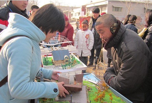 精致逼真的別墅模型很快吸引了許多村民的圍觀。學(xué)會(huì)成員在自報(bào)家門,說(shuō)明來(lái)意后就模型熱情的講解有關(guān)建筑節(jié)能減排的內(nèi)容。一座能拆合的別墅模型勾起了在場(chǎng)村民的好奇心,講解人員從別墅與普通平房的相似處講起,拉近了與村民的距離。他們認(rèn)真的聽完后與同學(xué)們熱烈地討論起常見的低耗環(huán)保措施,如使用雙層玻璃,墻體砌入麥秸等。一座精巧的高樓結(jié)構(gòu)模型引起了一位小男孩的注意,在講解人員的鼓勵(lì)幫助下他站了上去,露出難以置信的表情。當(dāng)?shù)弥P腿坎捎蒙钣闷罚鐥売脹鱿,回收的一次性筷子等材料時(shí),村民們笑著豎起了大拇指。整個(gè)活動(dòng)中前來(lái)參觀的人絡(luò)繹不絕,寒冷的天氣阻擋不了大家的熱情。