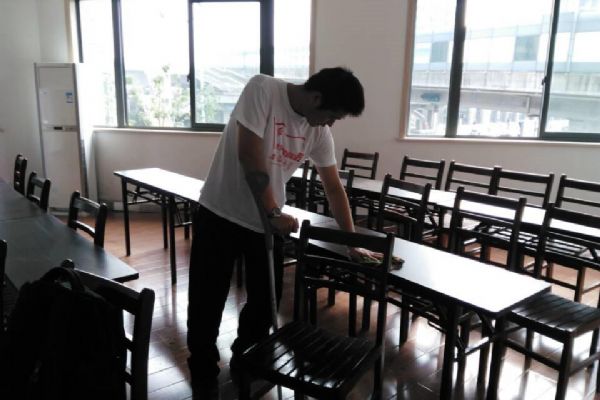 看,咱們的小伙伴周健同學(xué),清晨第一個來到社區(qū),并開始了一天中最簡單的打掃衛(wèi)生工作。一個人,晨光下,幾排桌椅被擦的锃亮!陽光、樂觀的他雖然行動沒有那么方便,但我們相信此時勞動著的他是快樂的。同時,我想這種精神也是值得我們學(xué)習(xí)的。