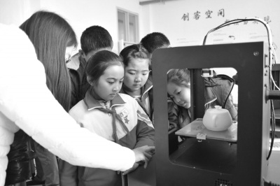 圖為山東省諸城市盧山小學的孩子們在老師指導下學習3D打印。該校專門設立“創客空間”,開設了3D打印課程,向“小創客”們傳授作圖軟件使用、模型制作、實例打印等技術。目前,“小創客”們已經能設計簡單的作品,并在老師指導下完成小茶杯、小茶壺、小白象、小飛機等作品的打印。季廷勇 攝