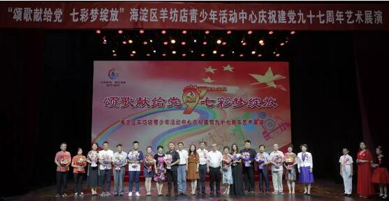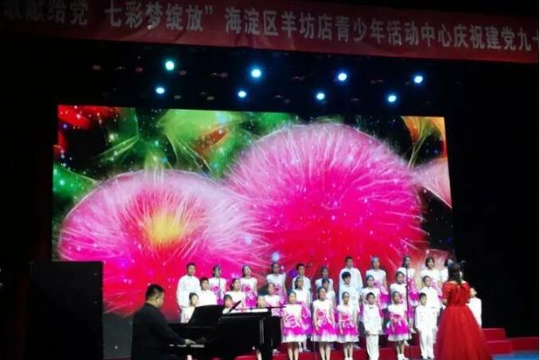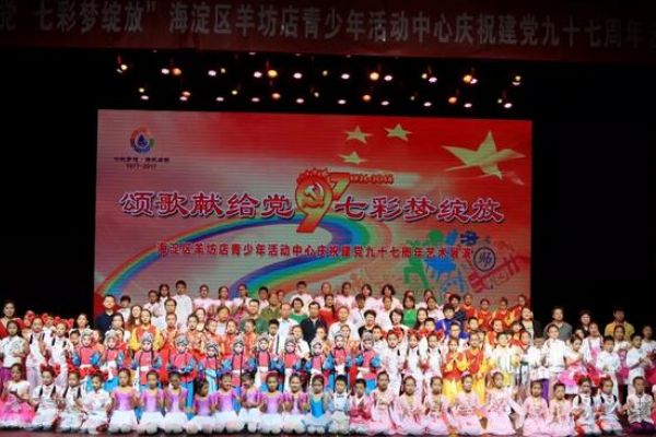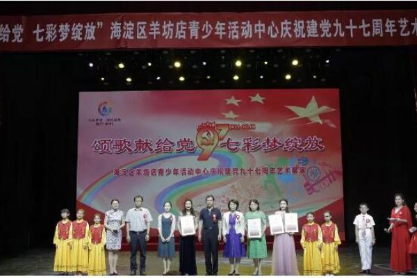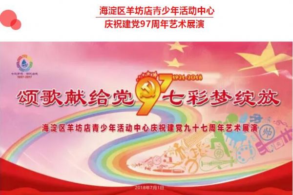 為了紀念中國共產黨建黨97周年,深入宣傳十九大精神和習近平新時代中國特色社會主義思想,深化社會主義核心價值觀教育,展示羊坊店青少年活動中心“七彩”特色校外教育成果,2018年7月1日,羊坊店青少年活動中心在宋慶齡青少年科技文化交流中心未來劇場隆重舉辦了“頌歌獻給黨 七彩夢綻放”慶祝中國共產黨建黨97周年藝術展演活動。