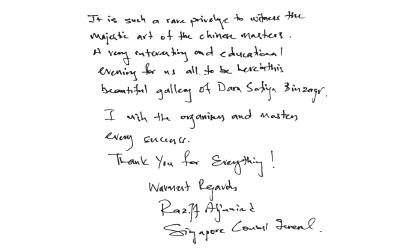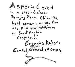 希臘駐吉達總領事卡爾皮瑞斯博士親筆留下的觀后感言:”一個在特別的地方舉辦的特別的鑒賞會,把中國最高級別的陶瓷藝術精品從中國帶到了沙特!”