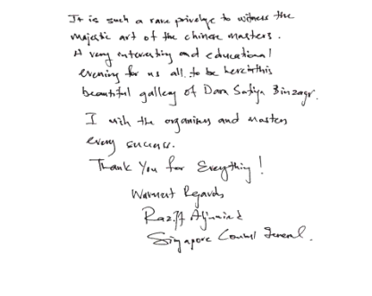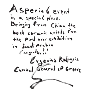 希臘駐吉達總領事卡爾皮瑞斯博士 親筆留下的觀后感言:”一個在特別的地方舉辦的特別的鑒賞會,把中國最高級別的陶瓷藝術精品從中國帶到了沙特!”