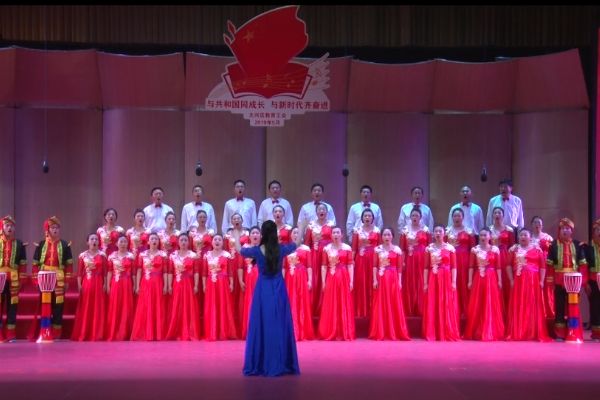 決賽現場,三十支參賽隊伍的表現精彩絕倫,整個劇場熱潮涌動,各參賽隊隊員們著裝各具特色,異彩紛呈,神情從容自信,歌聲悠揚動聽。團河小學教師合唱隊縱情高歌,唱響時代與夢想的主旋律。《太陽最紅毛主席最親》表達了對偉大領袖毛主席最崇高的敬意,《歌唱祖國》表達了對祖國最真誠的贊美和祝福,宛轉悠揚的歌聲感染著在場的每一位聽眾。