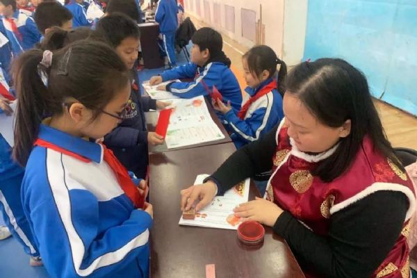 活動當天,學生們手持英語節(jié)日交流手冊到各個展位進行交流,能正確表達相應節(jié)日的用語及習俗,就會得到通關印章和小禮物,集齊春節(jié)、端午節(jié)、元宵節(jié)等六個節(jié)日的印章就完成通關賽。