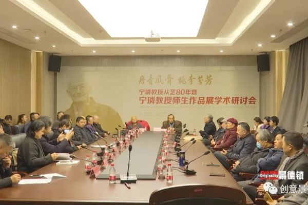 當天下午,寧璘教授從藝80年學術研討會在陶瓷文化高等研究院舉行。研討會由中國藝術研究院原常務副院長呂品田主持。全國各地與會專家30余人圍繞寧璘教授從藝80年歷程、寧璘教授的藝術成就、陶大現象、陶大辦學史展開研討。梅仕燦到會看望與會專家并臨場賦詩曰:“丹青風骨足稱奇,桃李芬芳天下知。今日群儒頌尊者,更崇寧老聳豐碑。”表達了對寧璘先生的崇敬之情。